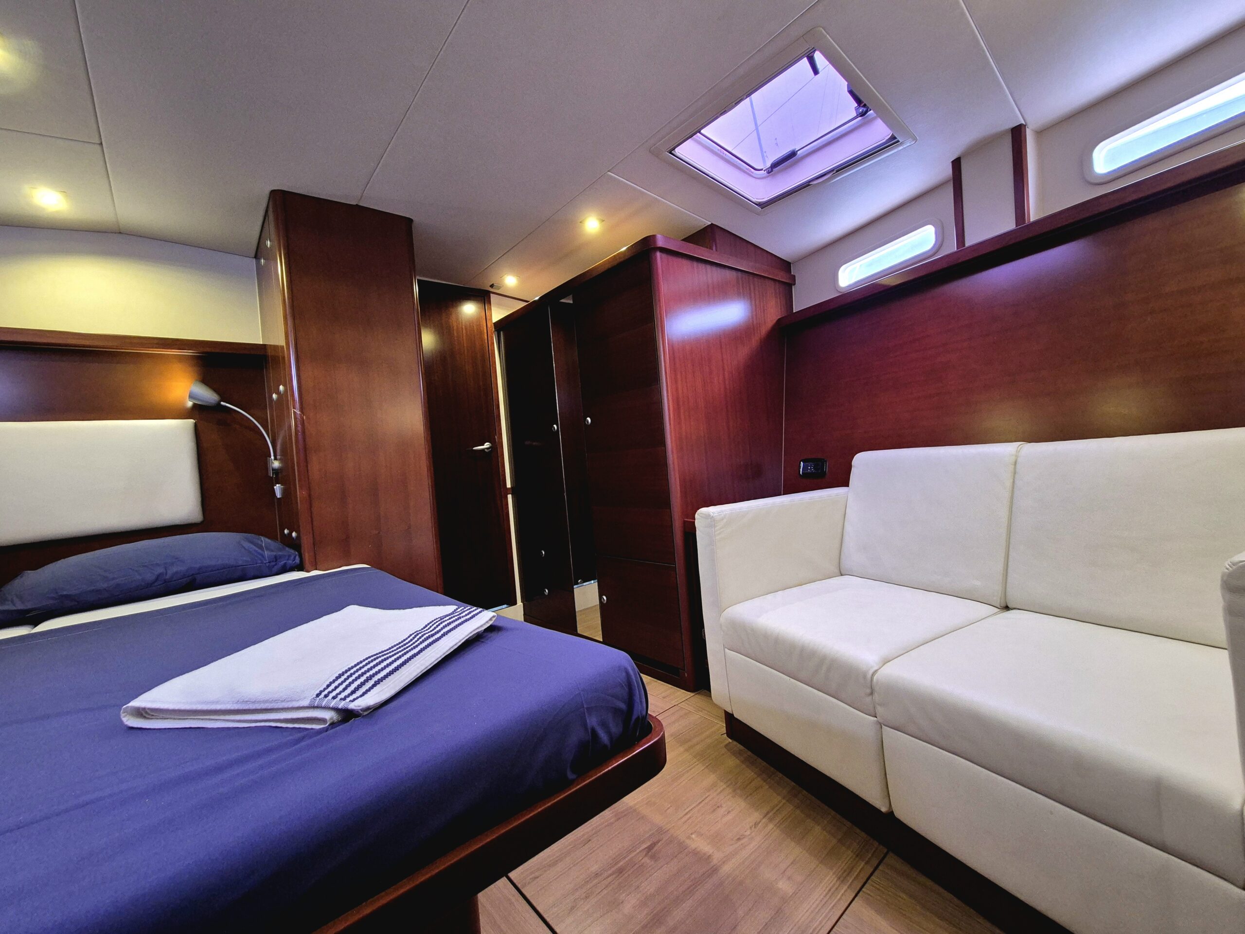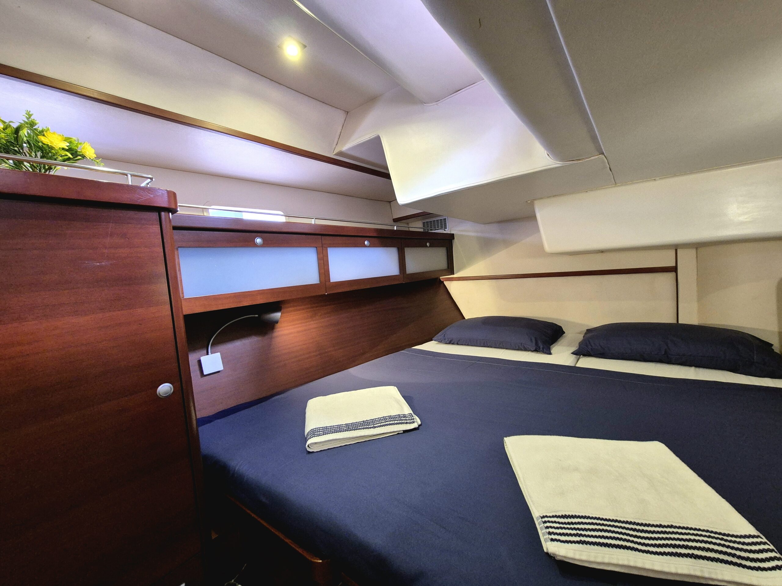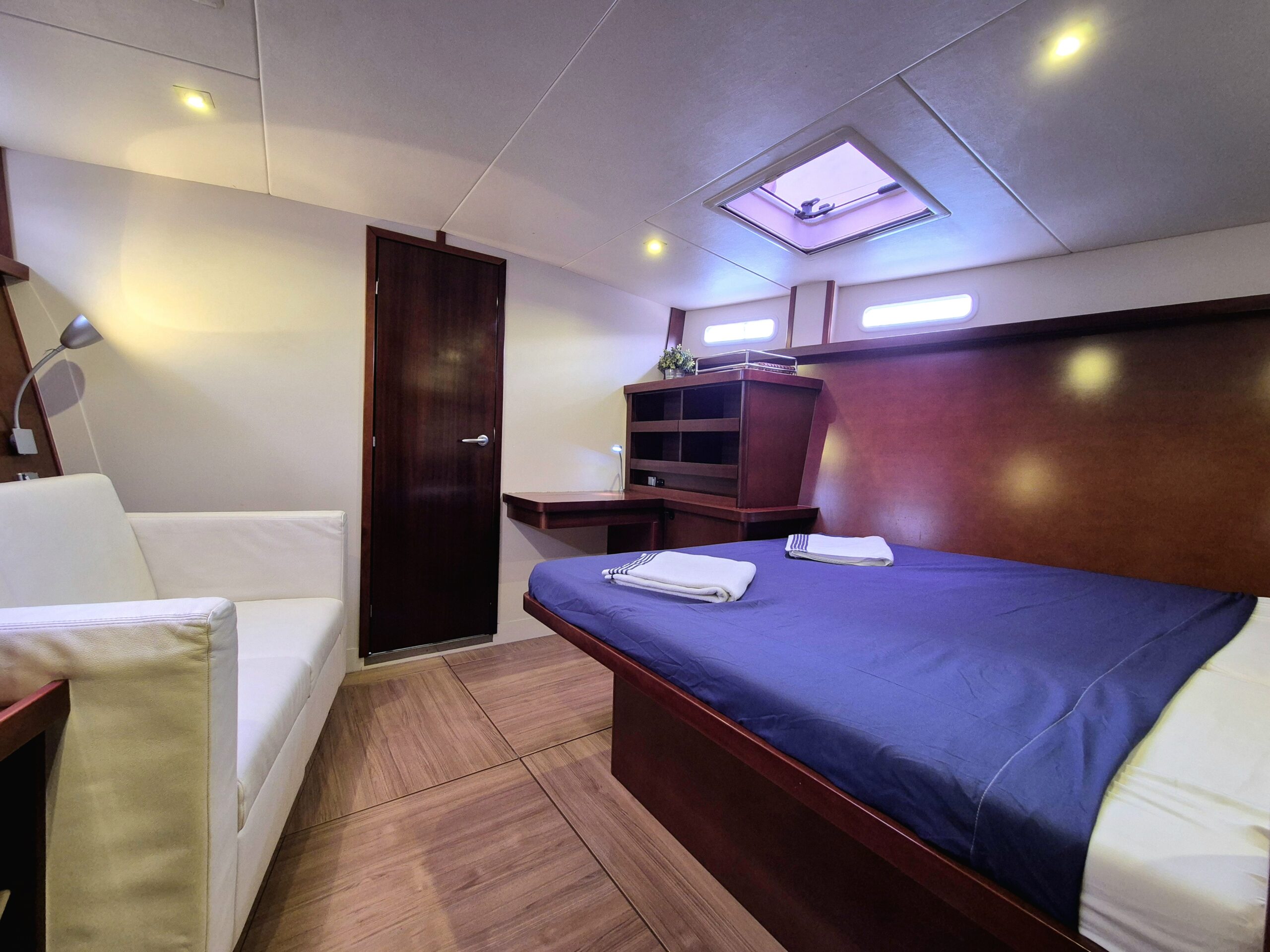Con capacidad ideal para hasta 6 huéspedes, el velero ofrece 3 cabinas dobles privadas, cada una con baño en suite, garantizando privacidad, confort y descanso durante toda la travesía. La distribución interior ha sido cuidadosamente diseñada para separar completamente las áreas de huéspedes y tripulación, brindando una experiencia íntima y relajada a bordo.
