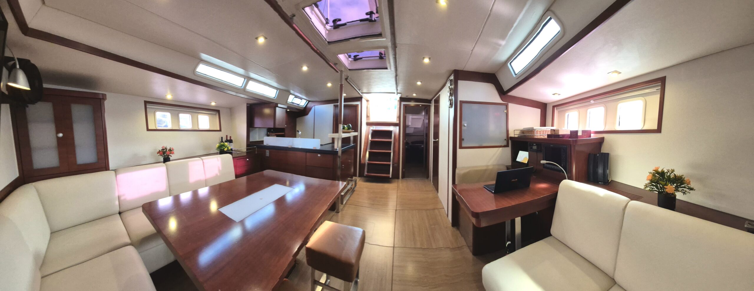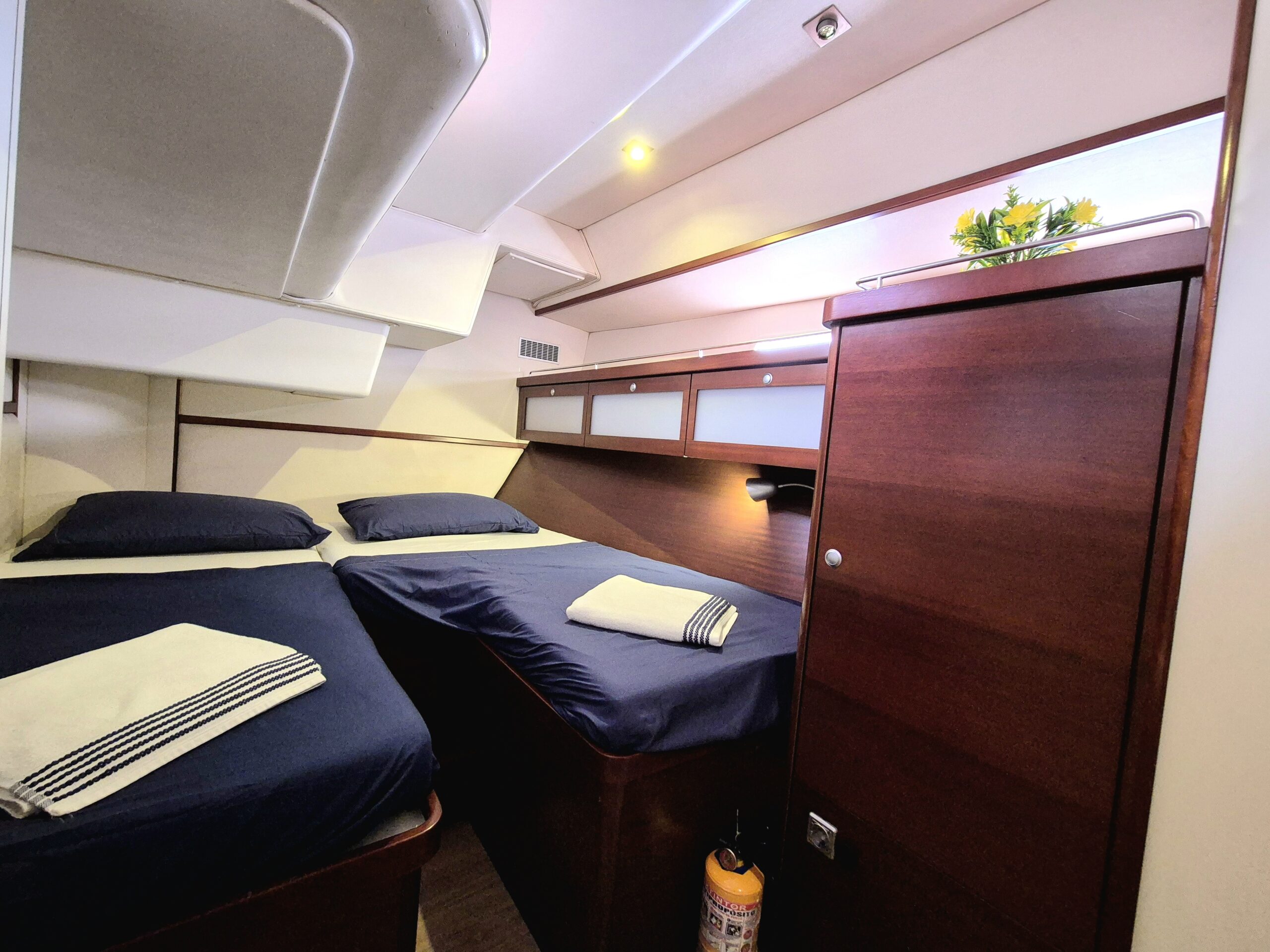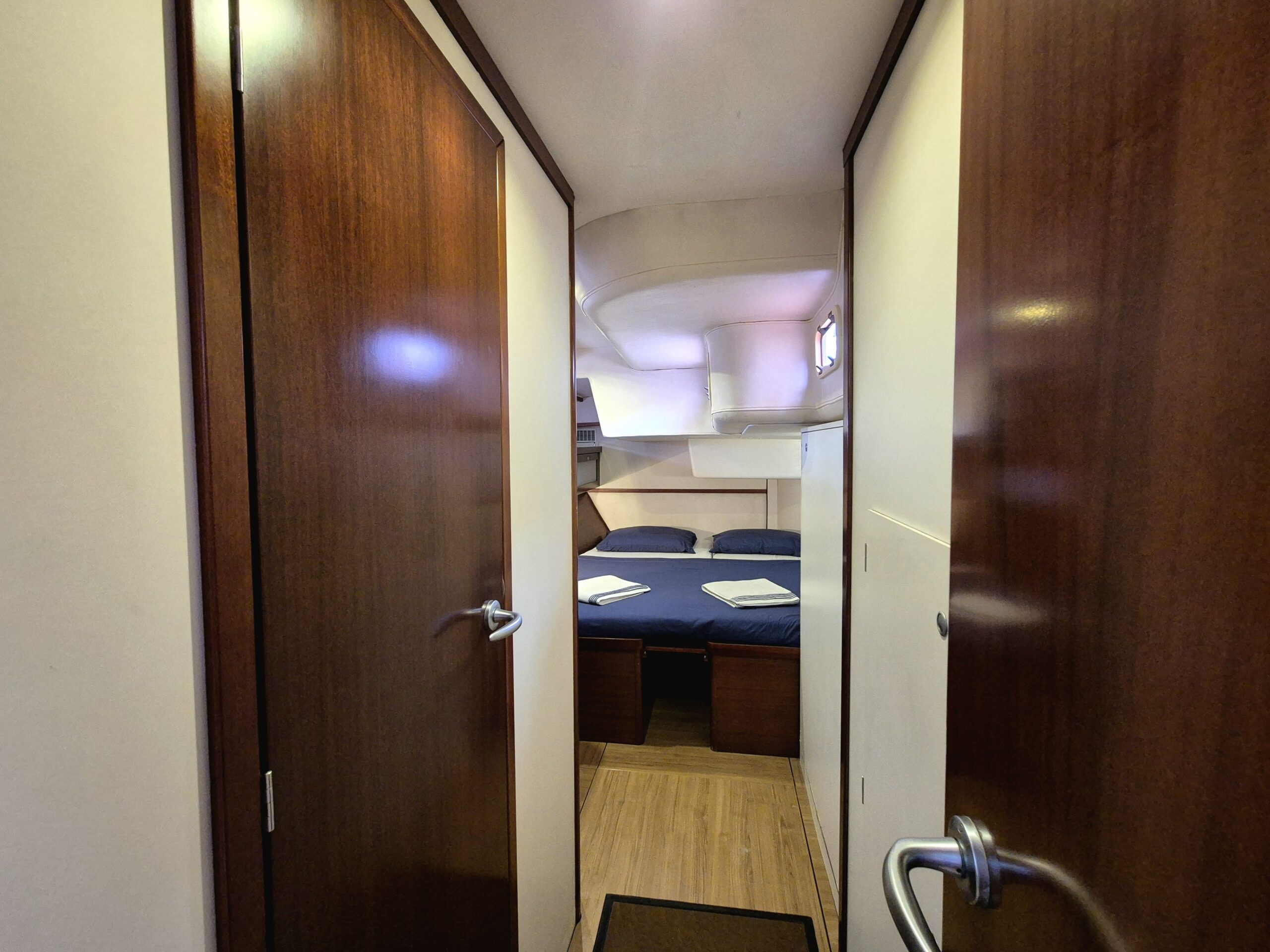 Con capacidad ideal para hasta 6 huéspedes, el velero ofrece 3 cabinas dobles privadas, cada una con baño en suite, garantizando privacidad, confort y descanso durante toda la travesía. La distribución interior ha sido cuidadosamente diseñada para separar completamente las áreas de huéspedes y tripulación, brindando una experiencia íntima y relajada a bordo.