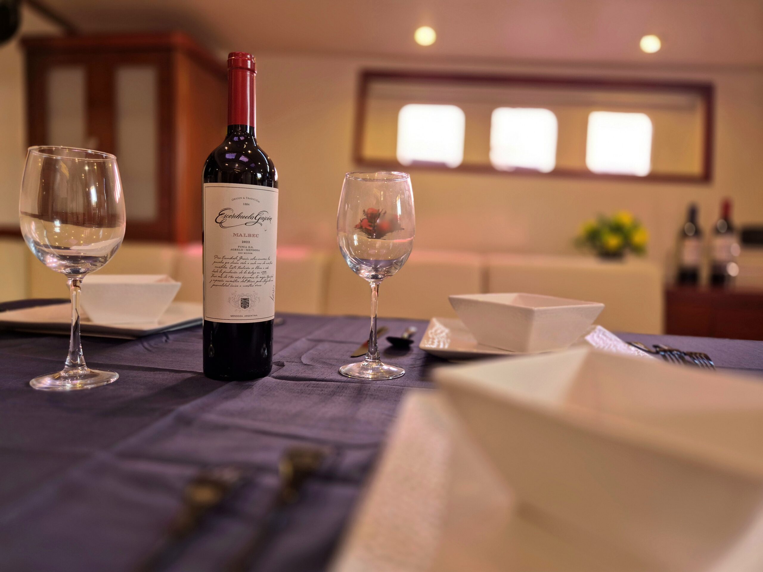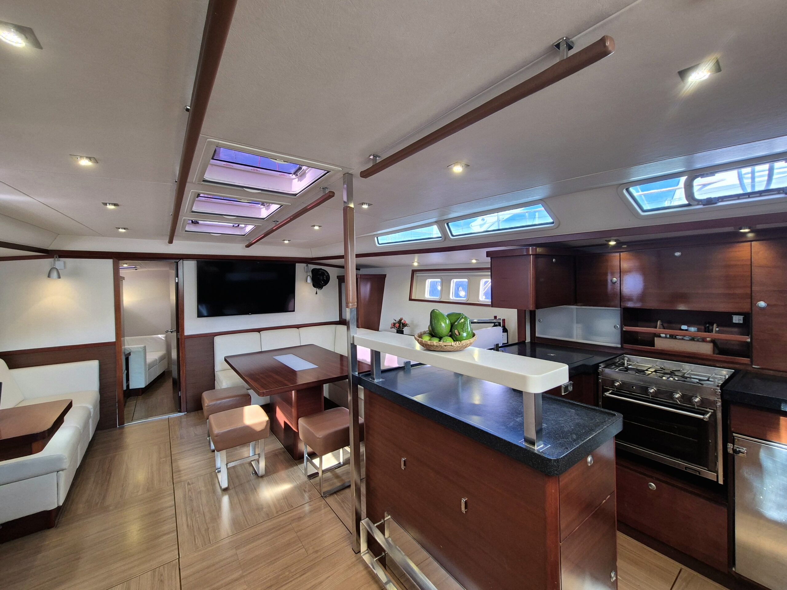 El salón principal ofrece un ambiente elegante y espacioso, ideal para relajarse, compartir momentos especiales o simplemente disfrutar del ritmo tranquilo de las islas. Todas las áreas de huéspedes cuentan con aire acondicionado, asegurando máximo confort en cualquier momento del día.