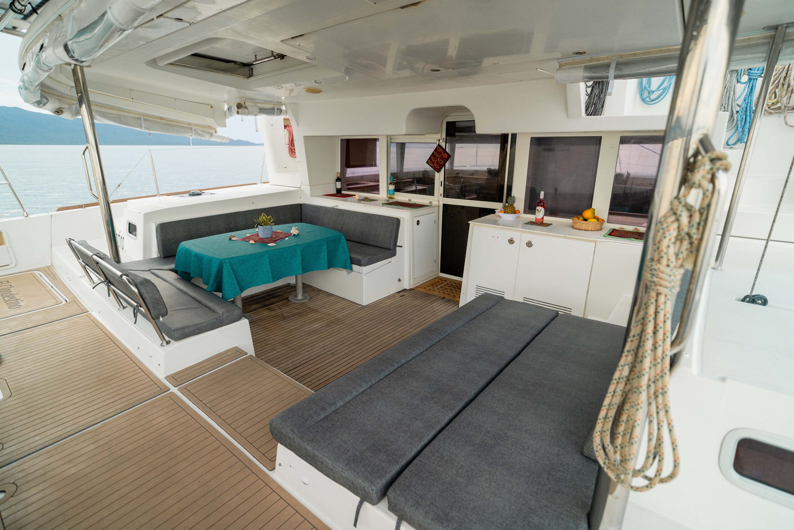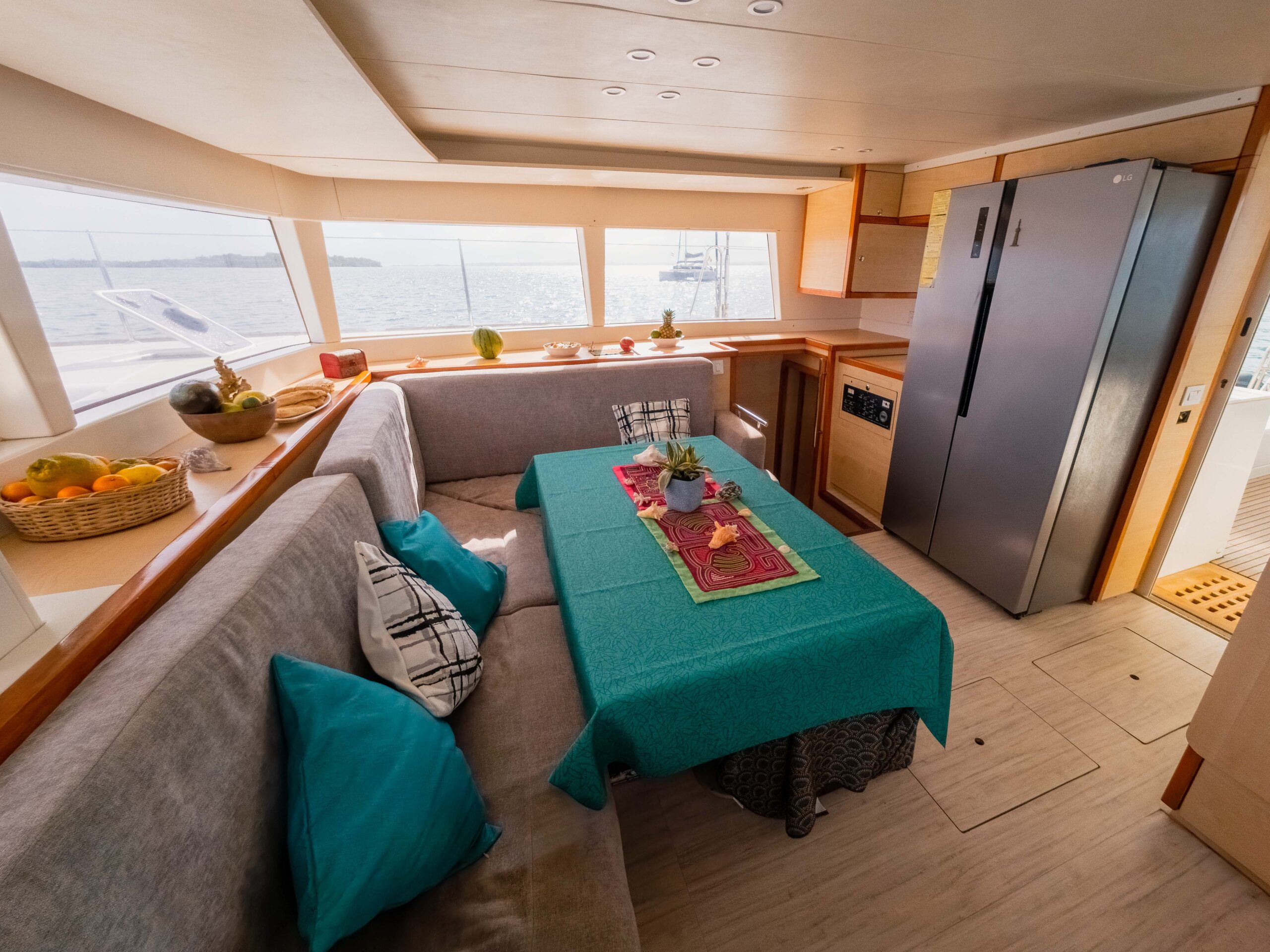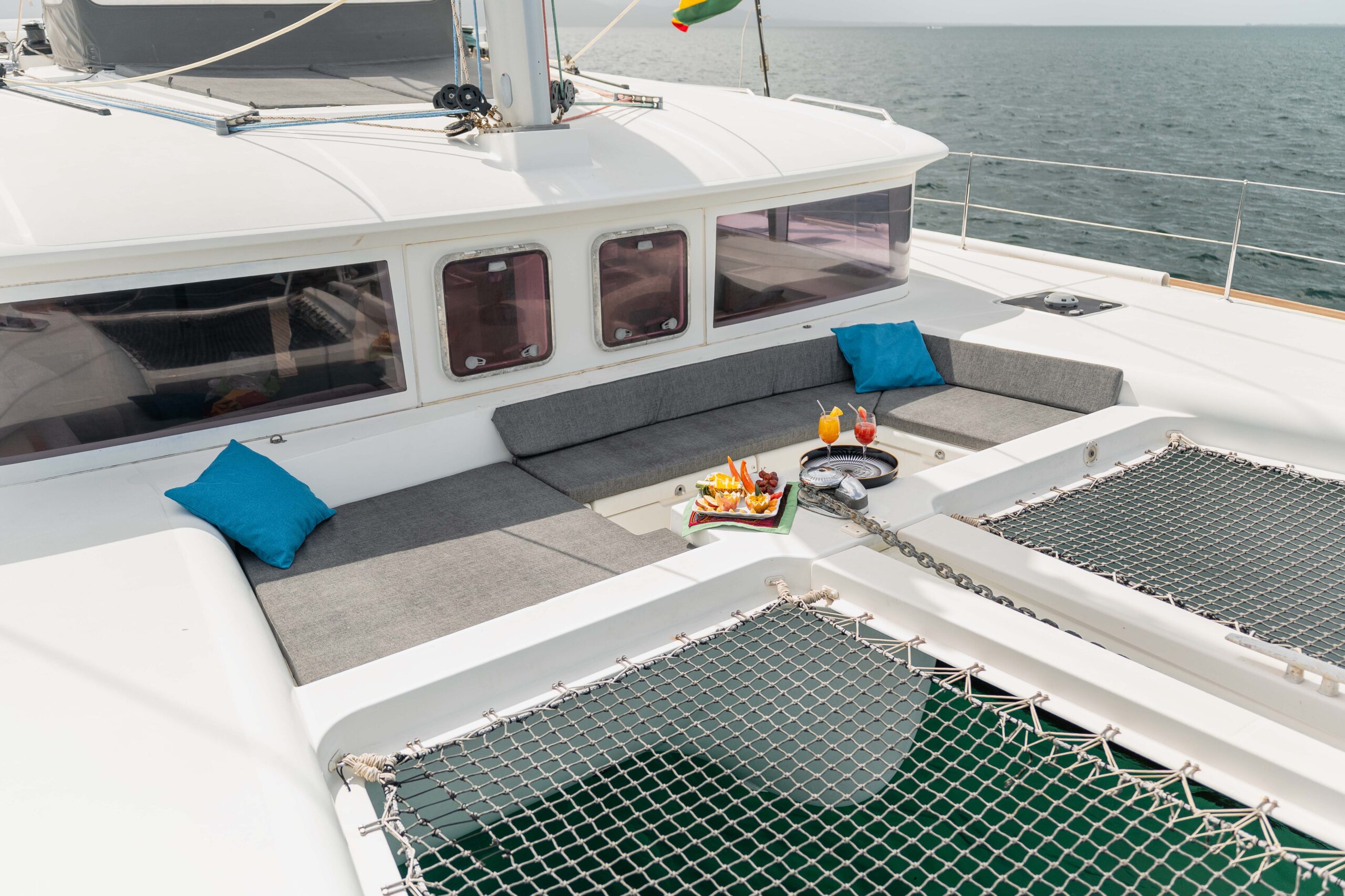 Disfruta de un amplio y cómodo espacio interior y exterior para disfrutar tus comidas al aire libre a la sombra. La proa del barco ofrece una amplia red para tomar el sol y relajarte con la espectacular vista del mar caribeño.