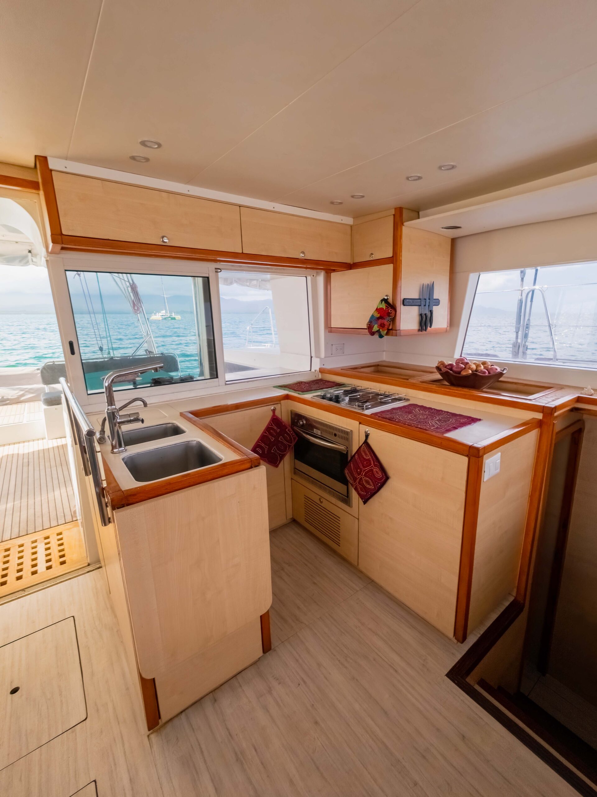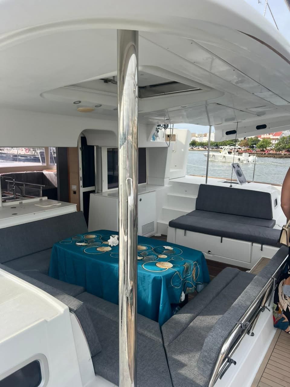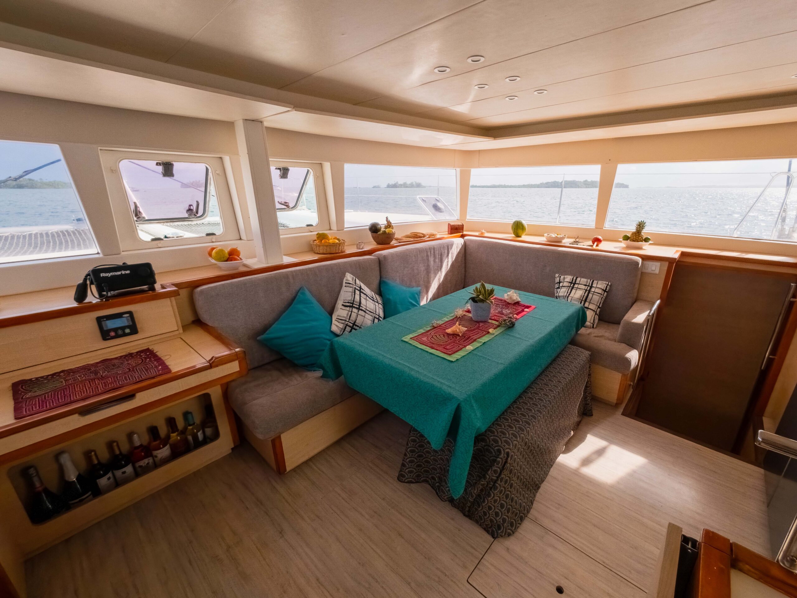Disfruta de un amplio y cómodo espacio interior y exterior para disfrutar tus comidas al aire libre a la sombra. La proa del barco ofrece una amplia red para tomar el sol y relajarte con la espectacular vista del mar caribeño.